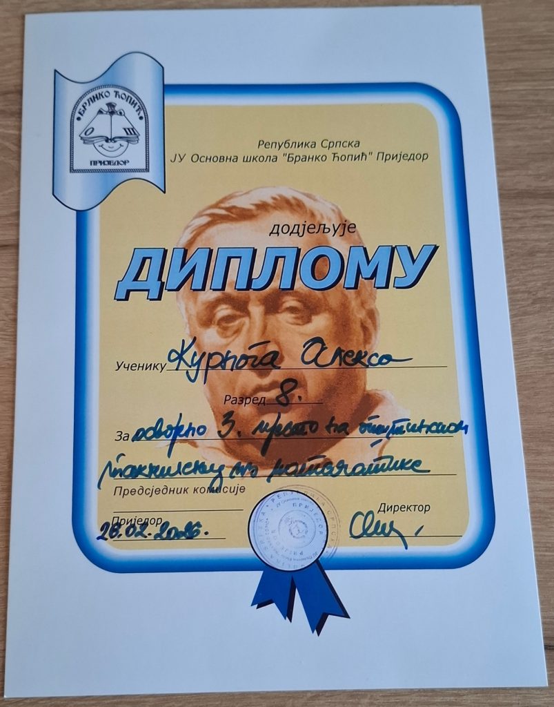8. разред – Алекса Курнога – 3. мјесто,