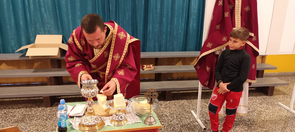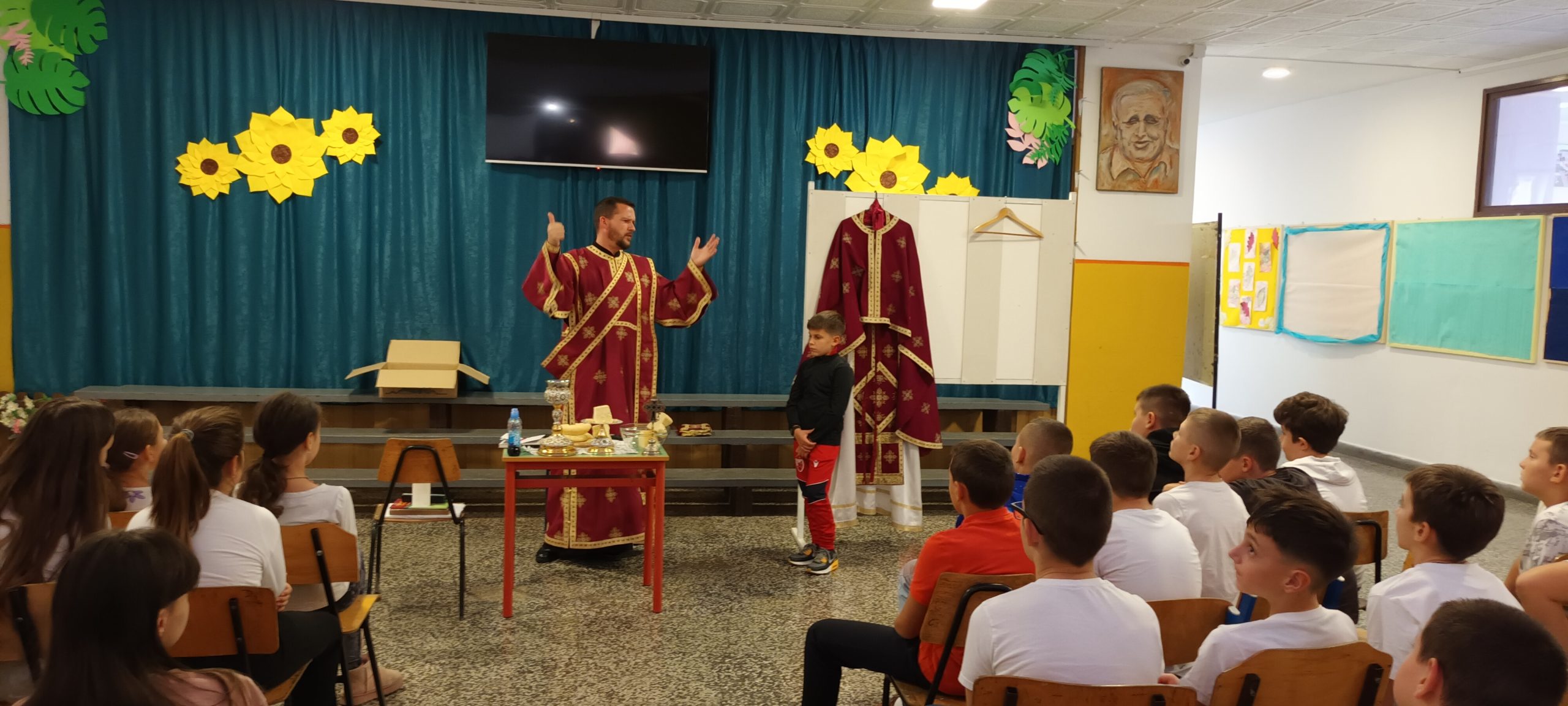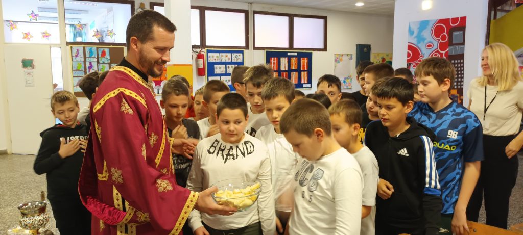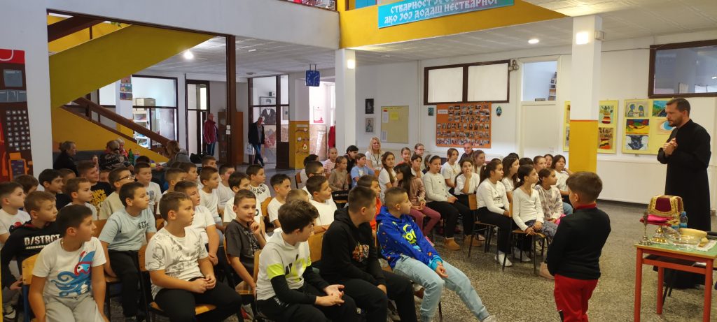 Данас је у холу наше школе, у оквиру наставне јединице „Подјела Свете Литургије“, вјероучитељ ђакон Ранко Милојчић одржао практичан час, током којег је ученицима петог разреда приближио важност Свете Литургије и њену подјелу.