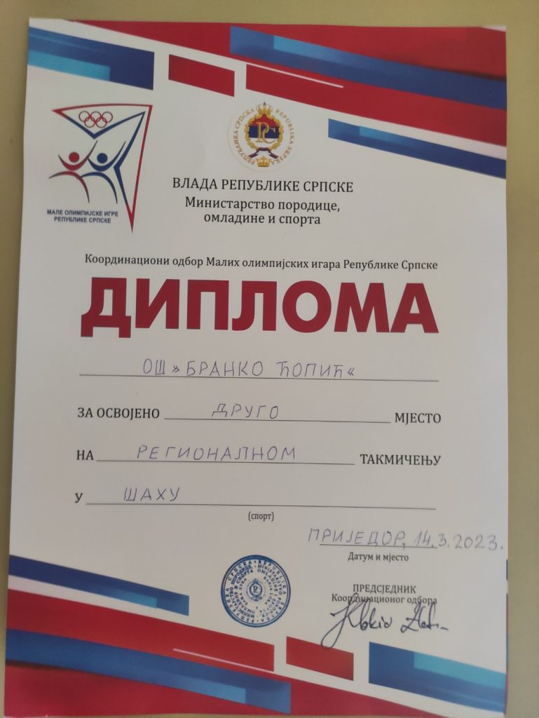 Регионално такмичење у шаху одржано је у ЈУ ОШ ,,Десанка Максимовић“ Приједор, 14.3.2023. године, под покровитељством Владе Републике Српске и Министарства породице, омладине и спорта. Наша школа је заузела друго мјесто, а пехаром, дипломом и медаљама су се окитили ученици: Михајло Ивић (VII -1) , Петар Буразор (V -2) , Никола Зељаја (V -1), Наташа Пархамов (V -1), Адријан Стјепић (V -1), Лазар Вуковић (V -1) и Петар Рађеновић (V -1). Ученике за ово такмичење је припремала учитељица Бранка Гајић. Техничка подршка је била од стране наставника Александра Мугоше.