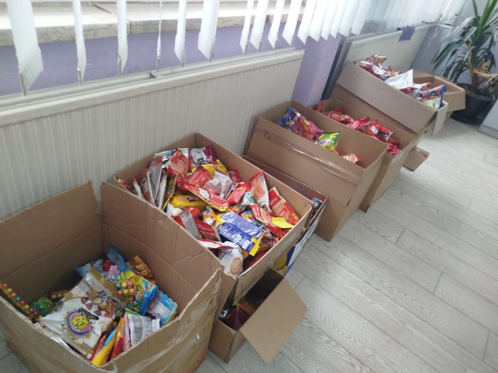Припрема дијела прикупљених слаткиша за хуманитарну организацију „Срби за Србе“, који ће бити искориштени за формирање новогодишњих пакетића за дјецу на Косову.