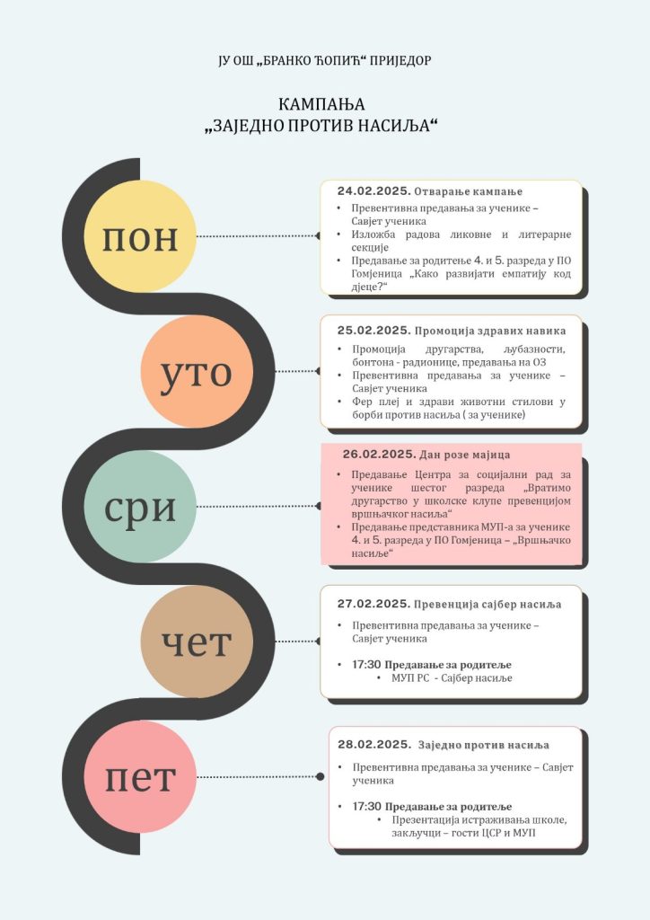 Седмица, 24.2- 28.2. 2025. у нашој школи биће посвећена важној теми – борби против вршњачког насиља. Под слоганом „Заједно против насиља“, који су изабрали наши ученици, кроз разне активности, радионице и предавања, заједно ћемо учити како да препознамо, спријечимо и реагујемо на било који облик насиља.