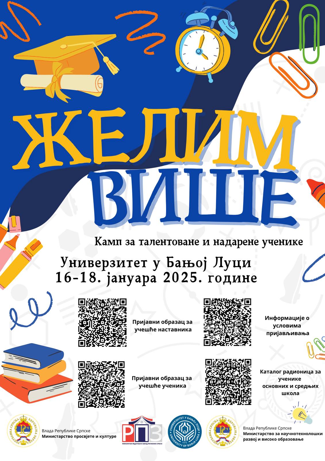 Републички педагошки завод Републике Српске и Универзитет у Бањалуци организују Зимски камп „Желим више“ за ученике основних и средњих школа. Заинтересовани ученици ће имати прилику да упознају примјену науке у свакодневном животу, учествују у радионицама, стекну нова знања, као и нова пријатељства. Пријаве за камп су отворене од 23. 12. до 10. 1. 2025. године.